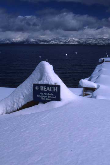 I like the irony in this photo. in Summer Sunnyside'd Deck is the hot spot for lunch and cocktails with the the back drop of Lake Tahoe. here the summer sign is almost buried under feet of fresh powder
